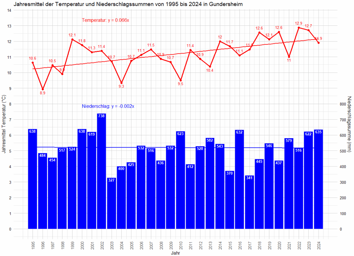 2018 und 2022 waren mit einer Jahresmitteltemperatur von 12,6°C die wärmsten Jahre seit 1995. Mit nur 11°C